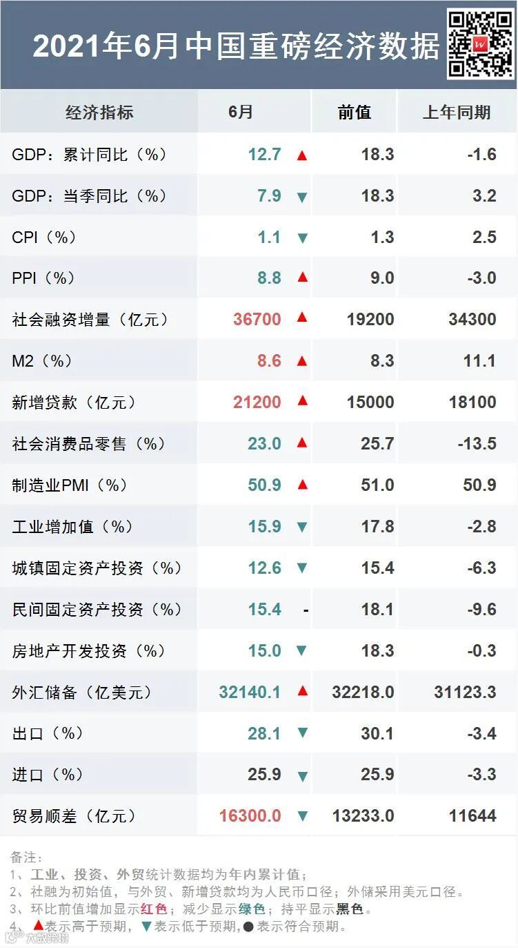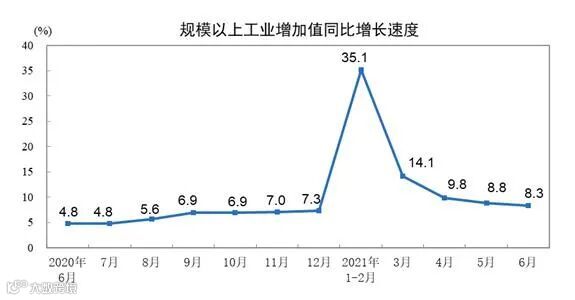 工业方面,1-6月份,中国规模以上工业增加值同比增长15.9%,两年平均增长7.0%。其中,中国6月规模以上工业增加值同比增8.3%,预期增7.8%,前值增8.8%。