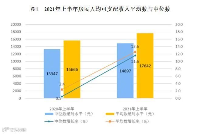 上半年,全国居民人均可支配收入中位数14897元,增长11.6%,中位数是平均数的84.4%。其中,城镇居民人均可支配收入中位数21517元,增长9.7%,中位数是平均数的89.2%;农村居民人均可支配收入中位数7956元,增长19.1%,中位数是平均数的86.0%。