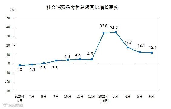 6月份,社会消费品零售总额37586亿元,同比增长12.1%;比2019年6月份增长10.0%,两年平均增速为4.9%。其中,除汽车以外的消费品零售额33719亿元,增长13.1%。扣除价格因素,2021年6月份社会消费品零售总额实际增长9.8%,两年平均增长3.2%。从环比看,6月份社会消费品零售总额增长0.7%。