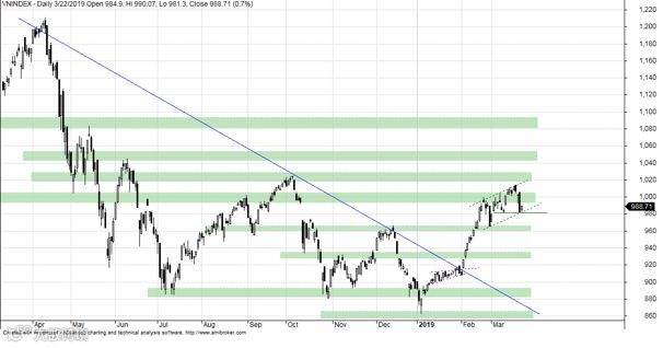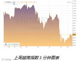 周一越南股市交易相当积极,越南指数恢复并上涨7.74点,收盘于1011.86点。然而,两个交易日购买力延续下降使得市场未能保持涨势。卖压增加,特别在周四一系列蓝筹股以及银行股被强劲抛售。跌幅同时蔓延到许多板块,越南指数下跌20.52点(跌幅2.05%)并跌破1000点区。周末,成交额放大但未能拉升指数回到以前的阈值。