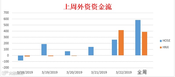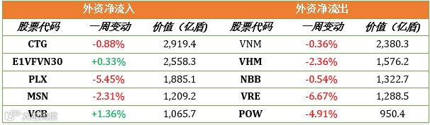 上周在胡志明交易所,外资交易活跃,其中4个交易日强劲净流入。在河内交易所,上周五突然大量净流入近4000亿盾,主力流入岘港港CDN股票。