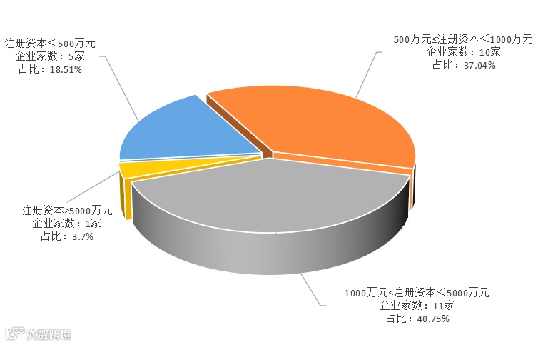 从企业规模来看,“专精特新板”挂牌企业的规模分布情况如下(图3):注册资本大于5000万元的共1家,注册资本在1000-5000万元、500-1000万元、500万元以下的分别为11家、10家、5家。企业注册资本主要分布在1000-5000万元,占“专精特新板”企业的40.75%。