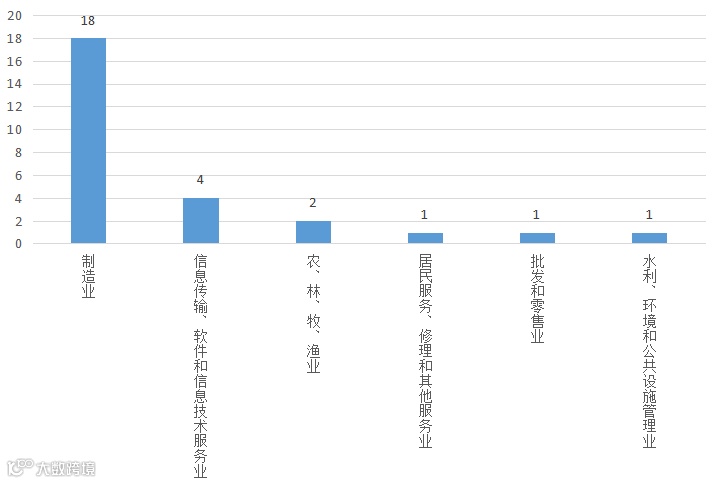 从行业分布来看(图2),共涉及6个行业,其中,制造业数量最多共18家,占“专精特新板”总数的66.67%;其次是信息传输业4家,农、林、牧、渔业4家,居民服务、修理和其他服务业1家,批发和零售业1家,水利、环境和公共设施管理业1家。