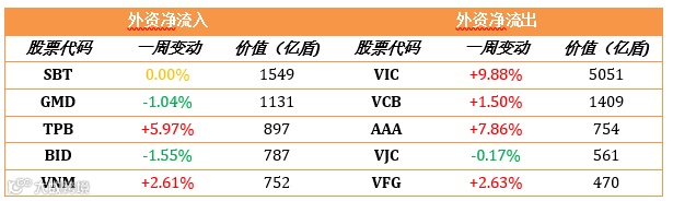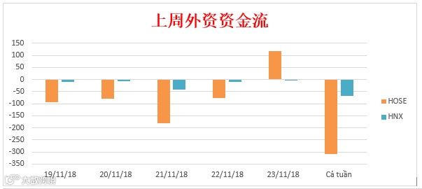 上周在两大证交所,外资净流出超4360亿盾。在胡志明交易所外资净流出超3670亿盾,河内交易所净流出超687亿盾。自营业务方面,买入额19,260亿盾,卖出价值17,950亿盾。