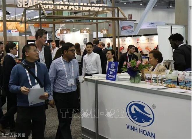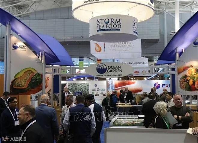 2019年美国波士顿国际水产展上的越南展位吸引参观者驻足观看 图自越通社