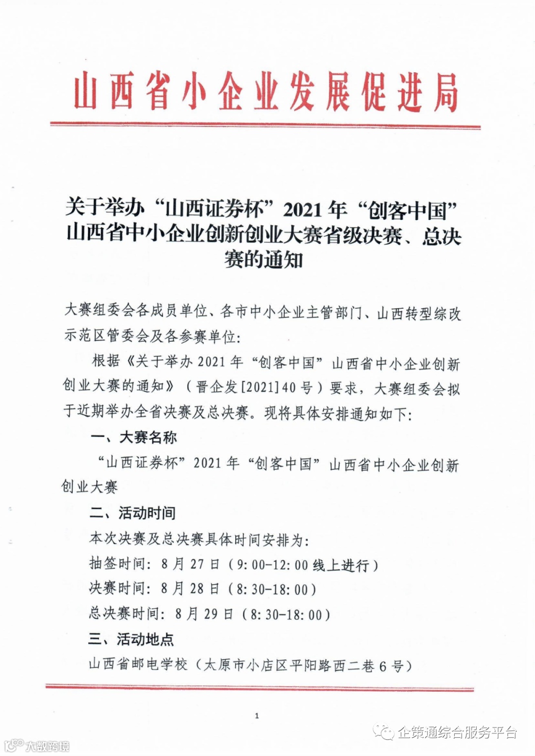 关于举办“山西证券杯”2021年“创客中国”山西省中小企业创新创业大赛省级决赛、总决赛的通知