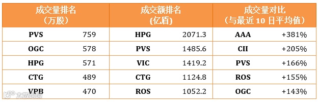 除此之外,证券,房地产,建设等板块中许多股票如胡志明证券HCM, FPT券商FTS,VNDIRECT证券VND, Coteccons建设CTD,西贡商信银行券商SCR,Vinaconex建设进出口VCG,一号电力建设PC1也上涨。油气股也吸引资大量金流入,特别是石油技术服务PVS上涨3.6%。