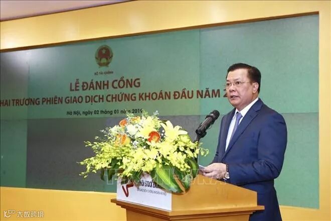 越南财政部部长丁进勇出席2019年开市敲锣仪式。图自越通社