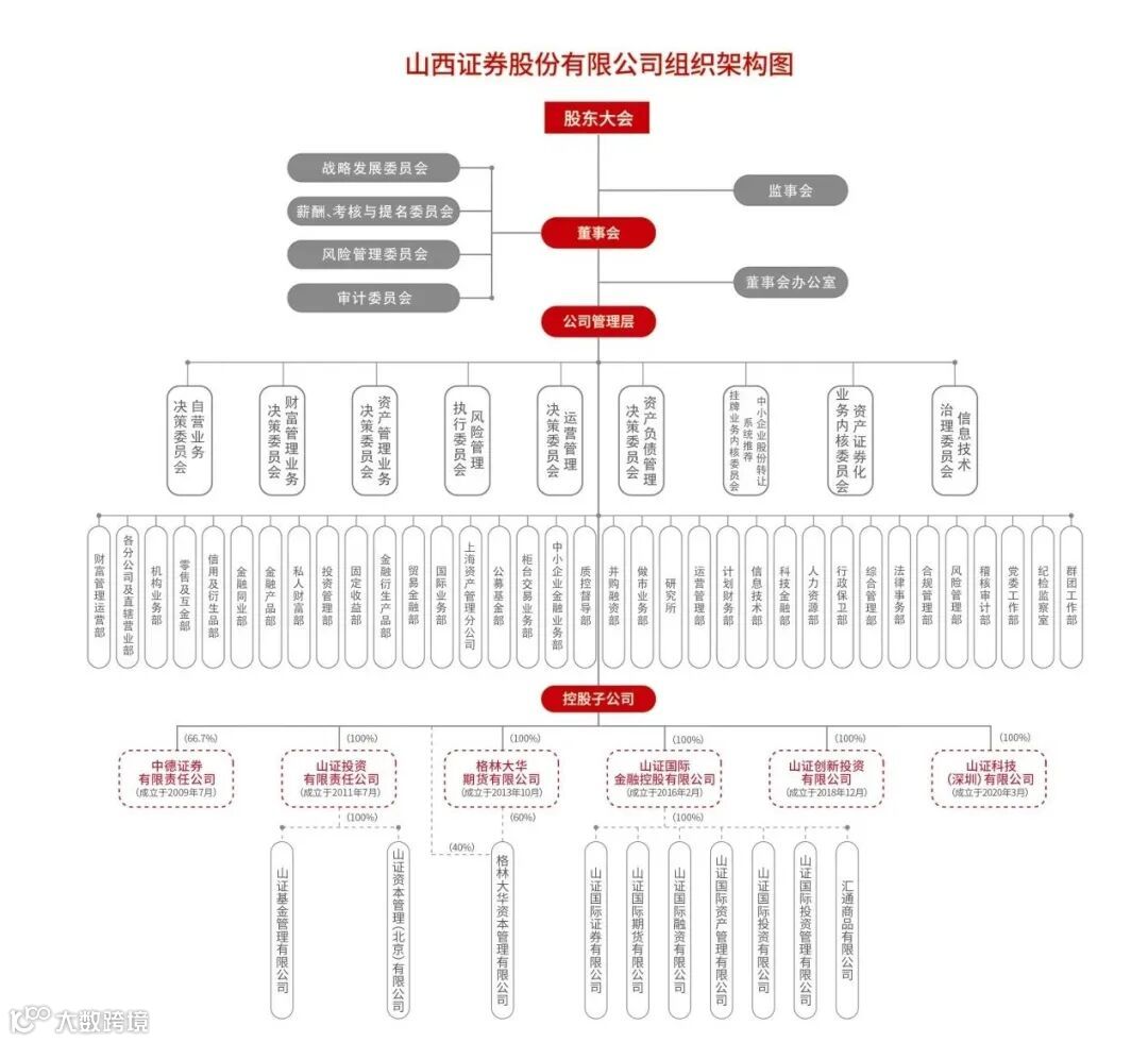 ;全资控股格林大华期货有限公司,致力于提供期货经纪、投资咨询业务及财富管理、资产管理、风险管理、中间业务等全方位、全产业链的金融服务;全资控股山证投资有限责任公司,致力于为具备风险承受能力的高净值个人和机构提供财富管理服务,同时向优质企业提供资金支持,协助被投资企业通过并购重组、IPO上市等途径做优做强;全资控股并在