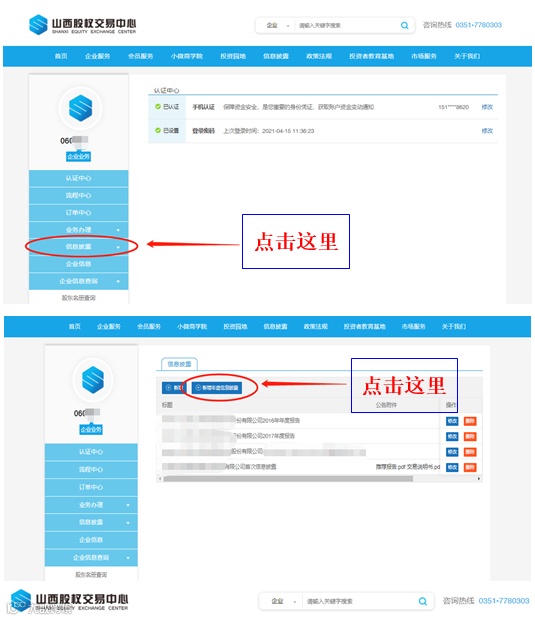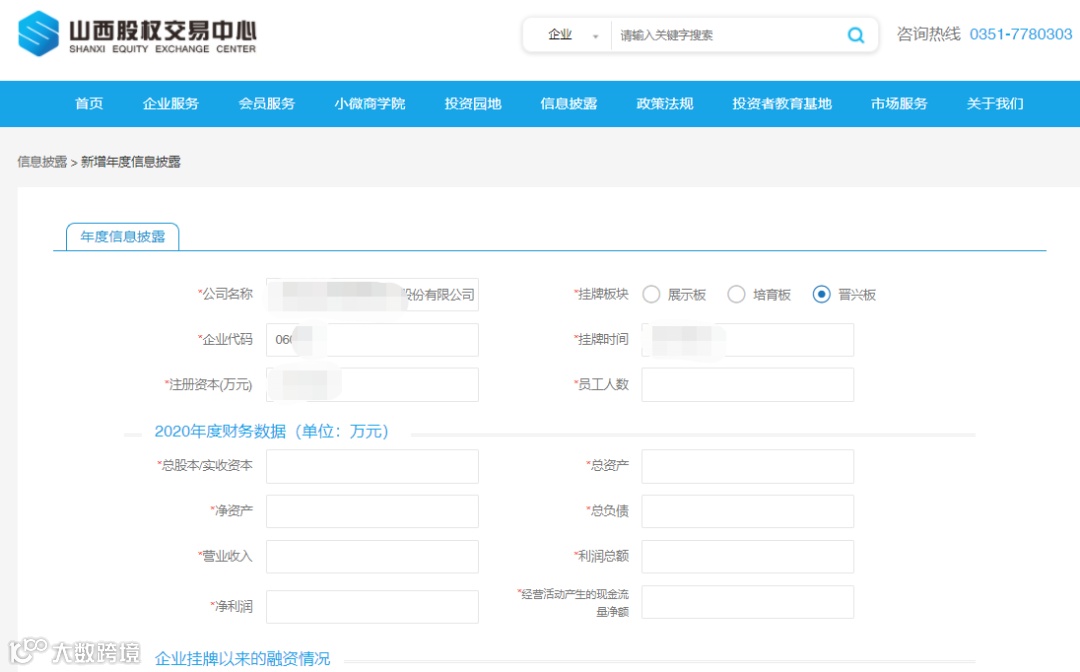 登陆山西股权交易中心官方网站(www.sxgq.net),首页——登录企业账号密码(账号密码均为挂牌企业代码)——点击信息披露——点击新增年度信息披露——填写网站企业基本信息、财务数据、