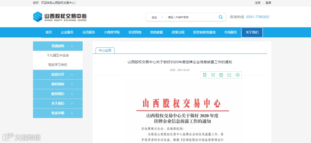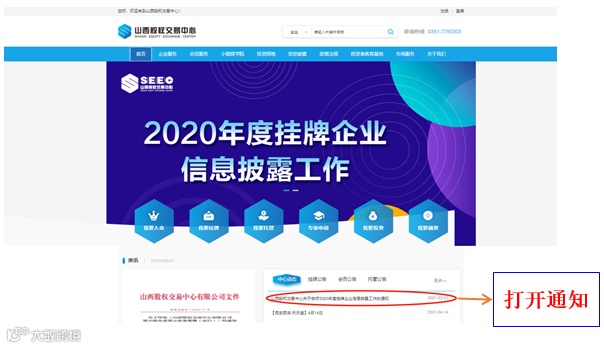 第一步:登陆山西股权交易中心官方网站(www.sxgq.net),首页——中心动态——打开通知《山西股权交易中心关于做好2020年度挂牌企业信息披露工作的通知》(2021年3月22日)