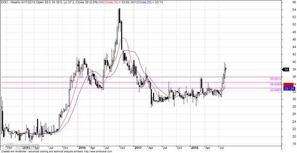然而,从短期来看,DGC可能将跟随整体市场出现调整信号。调整期结束后,短线投资者可以考虑进程。一些值得注意的支持区是36,000-34,4000 – 32,950盾。
