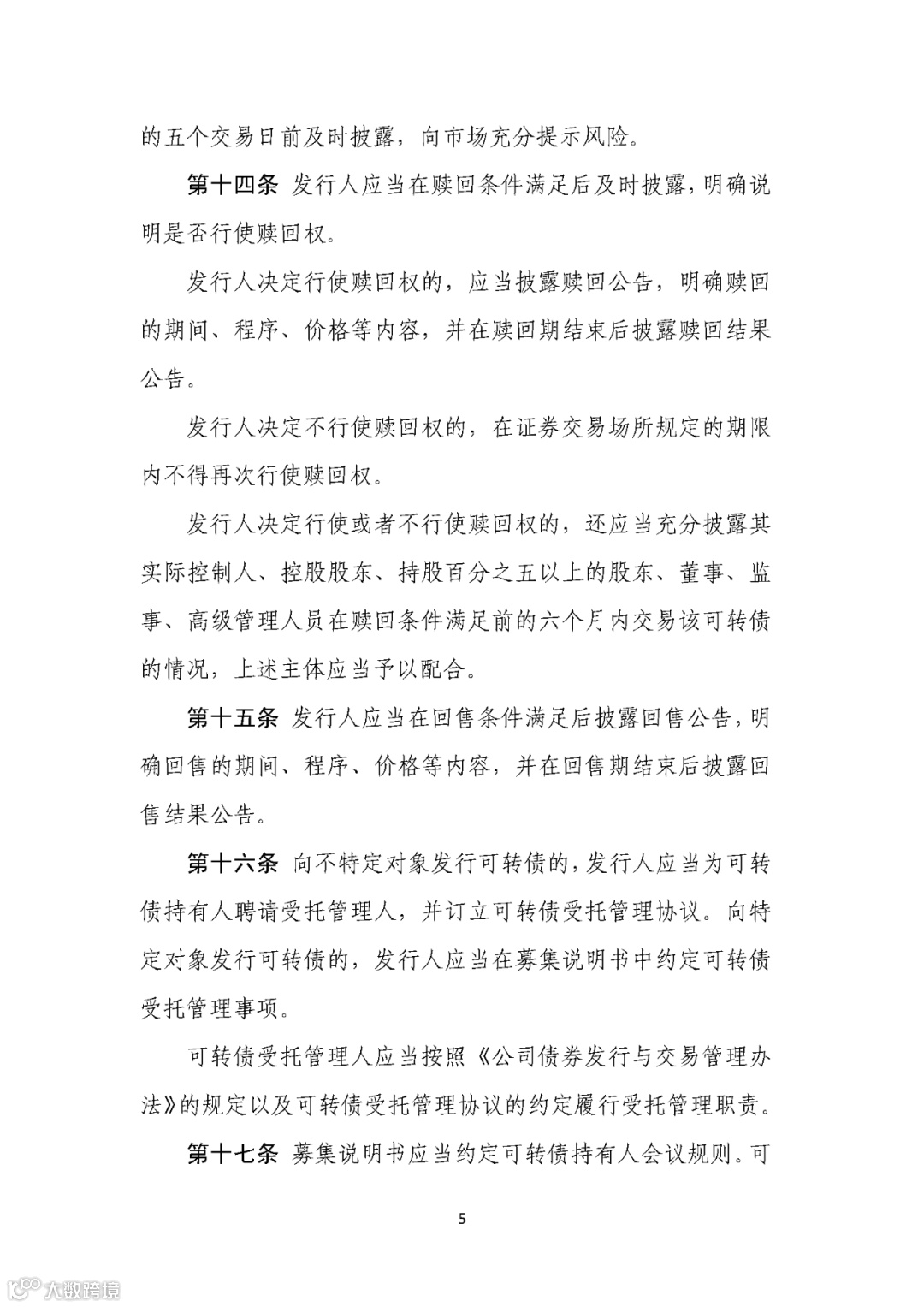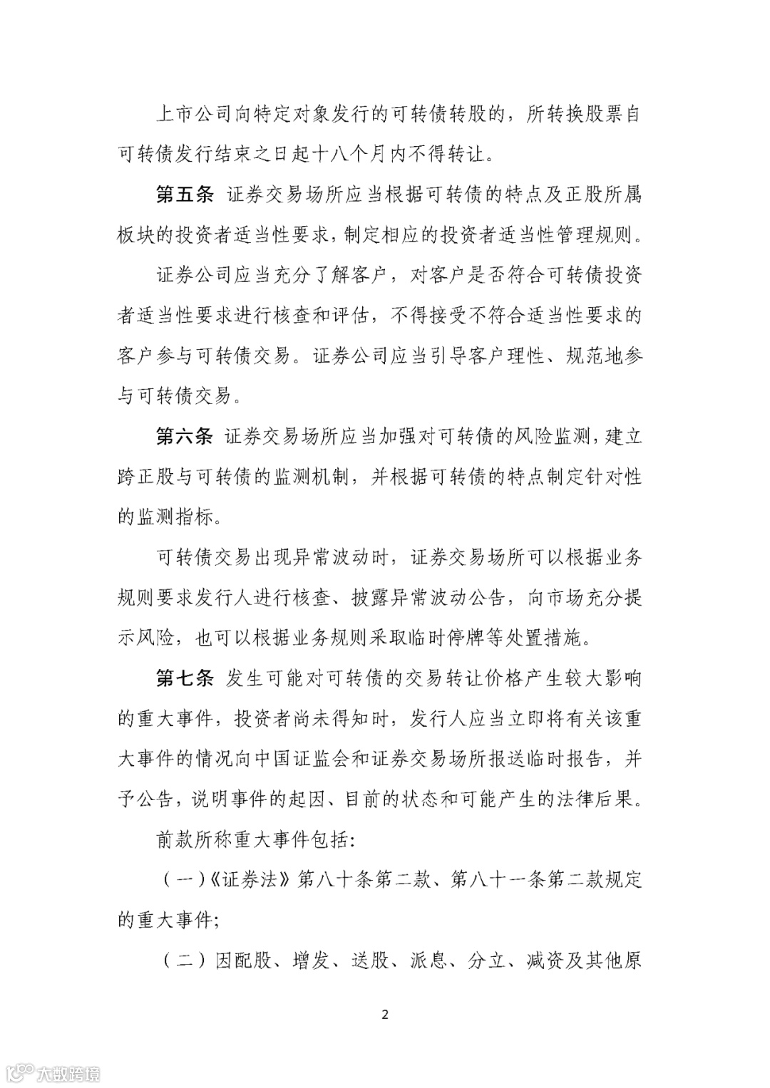 《管理办法》共23条,涵盖交易转让、信息披露、转股、赎回、回售、受托管理、监管处罚、规则衔接等内容,具体如下:一是关于交易制度。要求证券交易场所根据可转债的风险和特点,完善现行交易规则,防范和抑制过度投机,同时要根据正股所属板块的投资者适当性要求,制定相应的投资者适当性管理规则;明确强制赎回条款触发前后发行人的信息披露要求;明确证券交易场所的风险监测职责等。二是关于信息披露。以《证券法》第八十条、第八十一条关于信息披露的规定为基础,结合可转债的特点以及交易所实际监管经验,对临时披露重大事件进行了完善。三是关于转股价格。按照兼顾发行人、股东与可转债持有人权益的原则,结合现行再融资办法,对上市公司发行可转债转股价格的确定、修正及调整进行了完善。四是关于受托管理制度。依照《证券法》第九十二条规定建立可转债受托管理制度,明确受托管理人职责要求等。五是关于监管处罚。对于违反本办法规定的行为,证监会将采取相关监管措施;依法应予行政处罚的,依照有关规定进行处罚;情节严重的,对有关责任人员采取证券市场禁入措施;涉嫌犯罪的,依法移送司法机关追究刑事责任。六是关于规则衔接。《管理办法》不改变可转债现有发行规则,同时为上市公司向特定对象发行可转债购买资产预留一定的制度空间。七是关于新老划断。《管理办法》施行日及施行日以后发行申请被受理的可转债适用本办法,但是本办法有关交易规则、投资者适当性、信息披露、赎回回售等交易环节的要求,一体适用于已经发行和尚未发行的可转债。