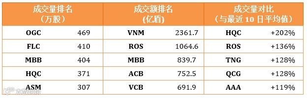 证券,银行,房地产,建设等龙头板块都下跌。反之,Thac Ba水电 TBC,Thac Mo水电TMP,庆和电力KHP,第三电力-水电DRL, 中部水电CHP等能量股以及金瓯石油肥料DCM,富美肥料DPM等化肥股上涨较好。