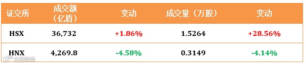 在胡志明证交所HOSE外资净流入886.5亿盾,河内证交所HNX外资净流出13.8亿盾。
