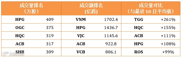 反之,和发钢铁HPG, 先锋银行TPB, Vicostone 瓷砖VCS, 马山集团MSN等大盘股下调部分抑制了整体市场的涨势。