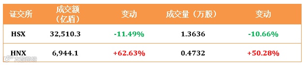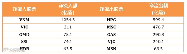 在胡志明证交所HOSE外资净流入552.7亿盾,河内证交所HNX外资净流出515.6亿盾。