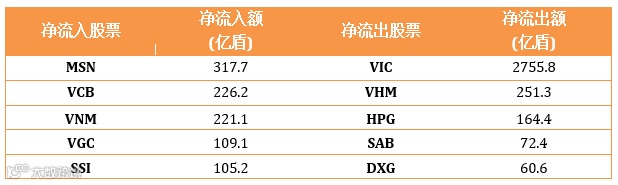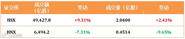 在胡志明证交所HOSE外资净流出2209.3亿盾,河内证交所HNX外资净流入81.4亿盾。