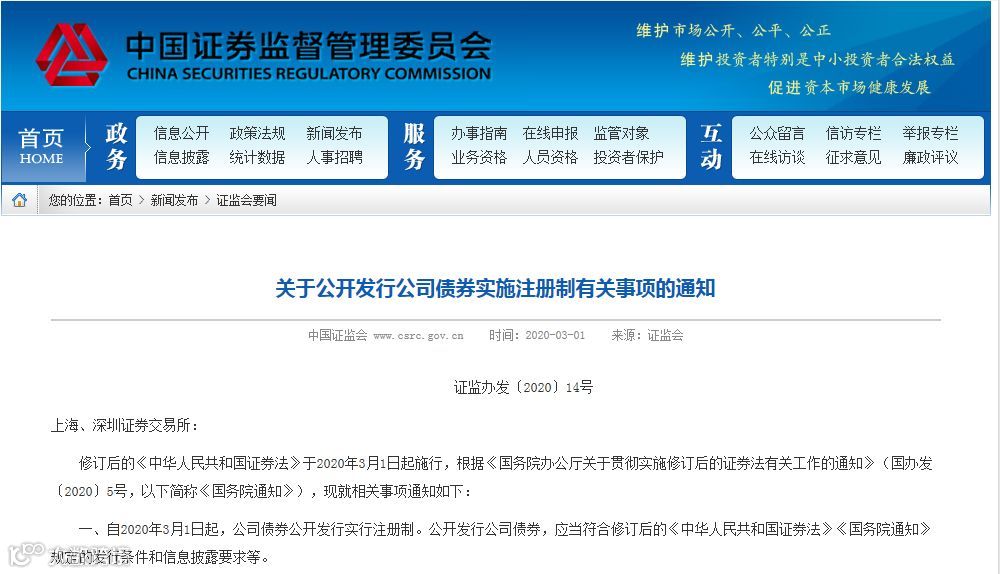 2月29日,国务院办公厅印发《关于贯彻实施修订后的证券法有关工作的通知》提出,落实好公司债券公开发行注册制要求。3月1日,证监会发布《关于公开发行公司债券实施注册制有关事项的通知》(简称《通知》),明确自3月1日起公司债券公开发行实行注册制。(点击文末阅读原文链接查看通知全文)