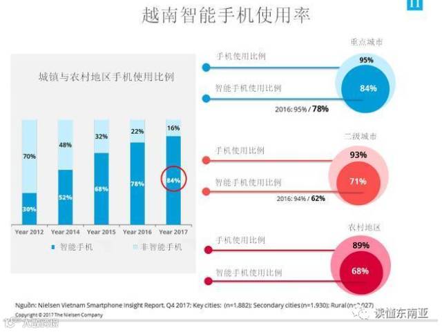 根據紐爾森越南2017年智能手機用戶行為調查報告,在重點城市地區,手機用戶高占人口的95%,其中智能手機用戶占所有手機用戶的84%,比2016年增長了10%。