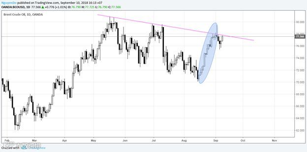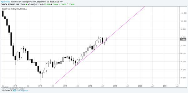第一:在月线上看,截至2018年8月底油价一直在从2017年44美元价区以来的长期上升趋势线上方。今年8月内,有时候油价跌破该线但月末价格再次冲上。长期上升走势线未被打破,这预示着该趋势仍被安全维持。