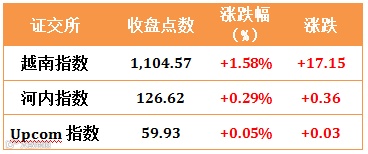 银行股公布令人印象深刻的业绩并成为市场龙头股推动越南指数再创新高。越南外商银行VCB和越南投资发展银行BID涨停;越南工商银行CTG和越南军队银行MBB,越南盛旺银行VPB,胡志明市发展银行HDB等银行中盘股也放量上涨,盘中涨停。此外,越南天然气GAS,越捷航空VJC等大盘股也涨停。虽然,越南牛奶VNM,西贡啤酒 SAB和多数小盘股下调但越南指数仍成功冲击1100点。