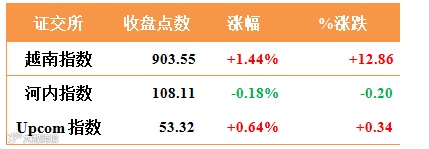 11月20日越南股市早盘有所回落后立即大幅上涨,最终越南指数收盘于903.55点(上涨12.86点,涨幅1.44%);河内指数收盘于108.11点(下跌0.2点,跌幅0.18%)。