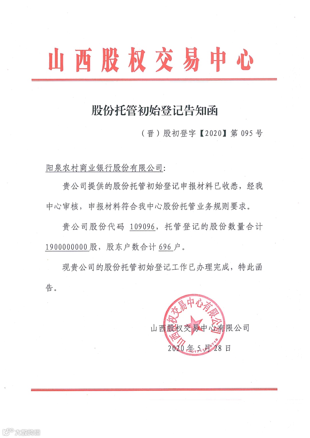 阳泉农村商业银行股份有限公司股权托管初始登记告知函
