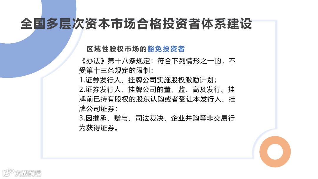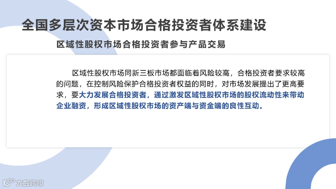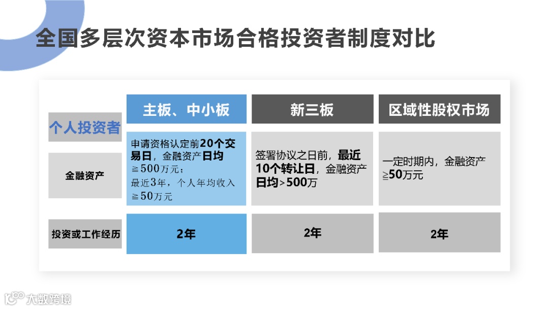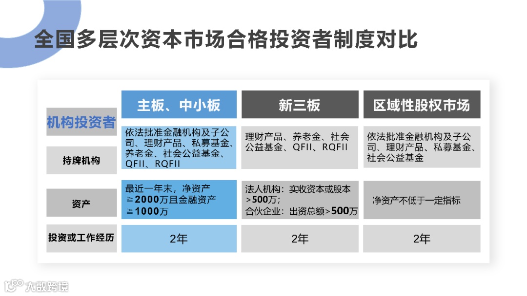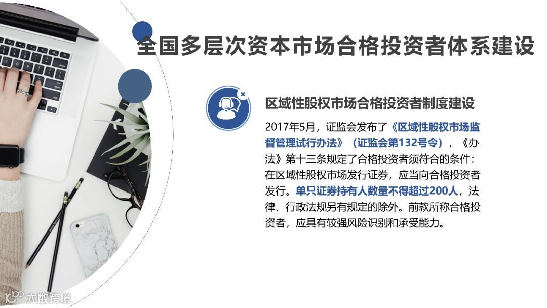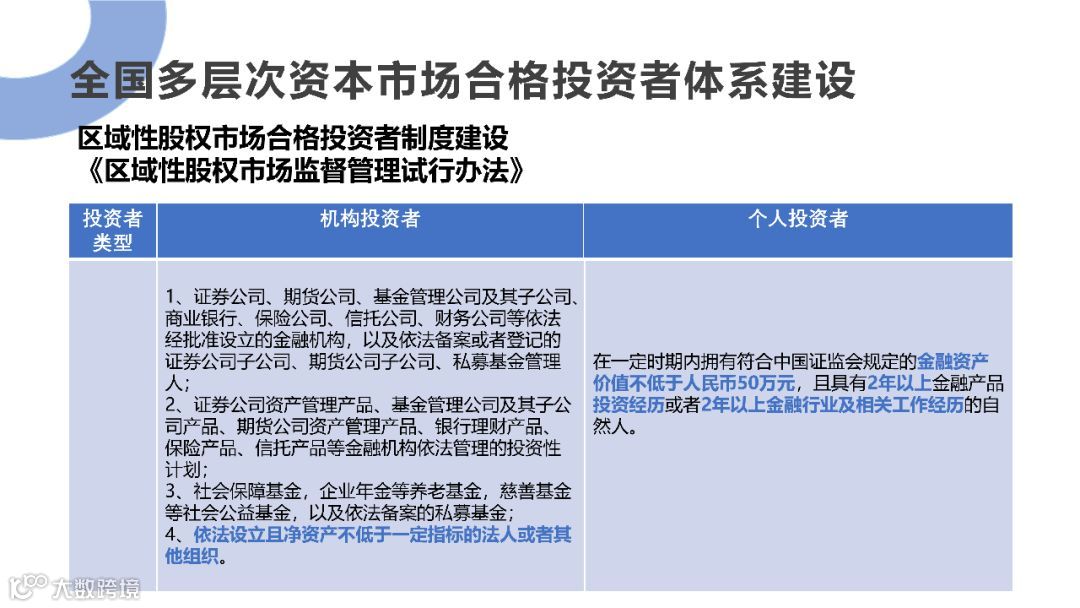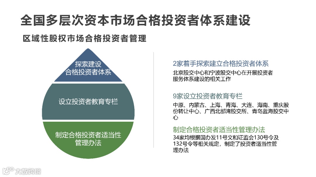 上一期我们为大家介绍了全国多层次资本市场体系中主板、中小板及新三板合格投资者体系建设情况,本期我们为大家着重介绍咱们区域性股权市场的合格投资者体系建设情况。