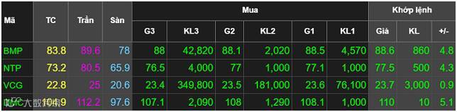 近期VCG, BMP, NTP,DMC同时大幅上涨。11月13日上午VCB上涨3.5%,NTP,BMP,DMC分别上涨5.3%,6%和 4.9%。