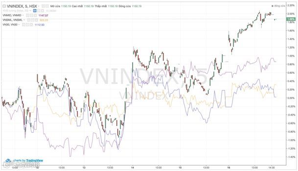 本周板块股价波动的5分钟图表表示,越南指数收盘上涨近2%,中盘股涨幅最大,VN30指数成份股正收集筹码以及涨幅低于小盘股。
