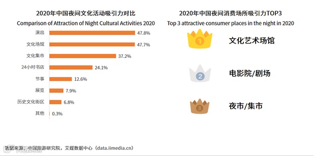 而2020年中国夜间文化活动中,文化艺术场馆在2020年中国夜间消费场所中所占比重最大。同时,随着“大文旅时代”的来临,对夜间消费场所的打造又提出了新的要求。
