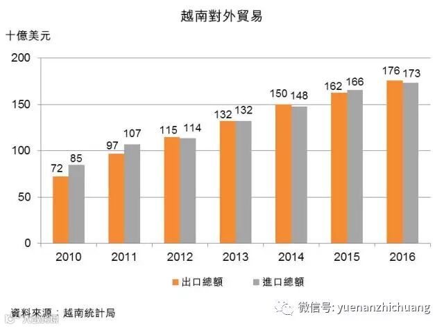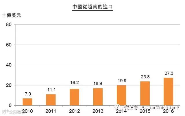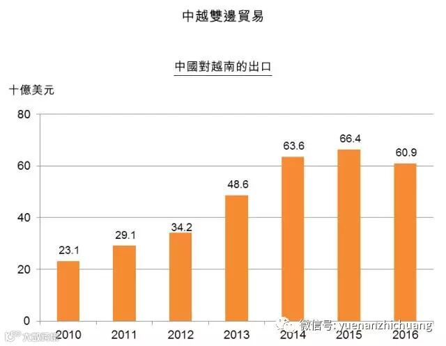 越南经济不断扩大,也促使该国与亚洲供应链建立商业联系。该国需要输入大量工业物料来支持其出口加工生产,来源地包括中国。据越南方面统计,2016年,约29%的进口来自中国,而中国市场亦吸纳越南出口的12%。[3]