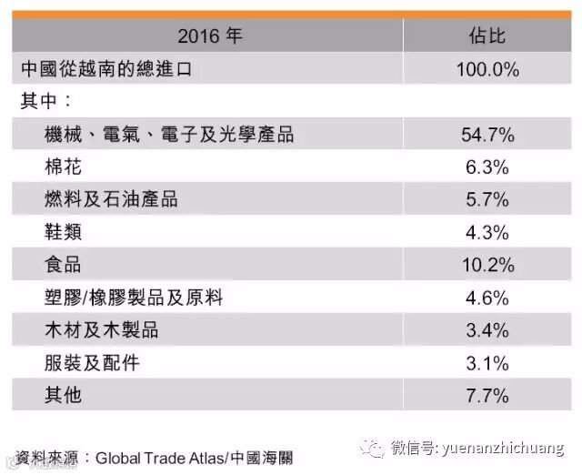 中国从越南的进口方面,机械、电气及电子产品也占进口总额的50%以上,反映在两国设有生产设施的相关制造商之间有频繁的业内贸易。在越南加工的某些消费品,如鞋类、塑料/橡胶制品和服装,以及若干类食品,也居中国从越南进口的前列。鉴于中国消费者的开支日趋增加,较长期而言,中国可能成为多类在越南加工的消费品及优质食品大有可为的市场。