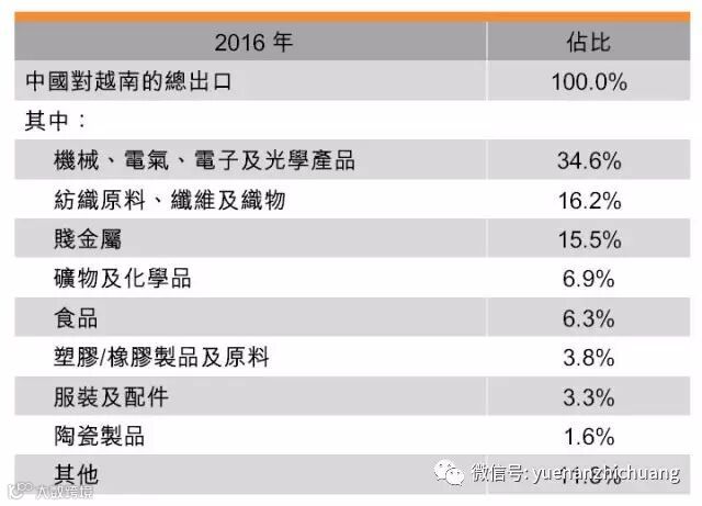 由于越南消费者对进口产品的需求日增,部分供消费用的食品、塑料及服装产品也占中国对越南出口的一小部分。
