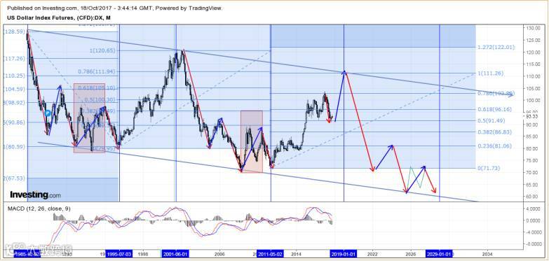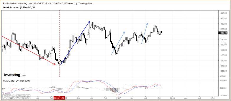 o 第二个中期上升浪仍从今年7月份1211美元上涨至2017年9月初1362美元。这一上升浪中的下行浪价格见底1262美元。