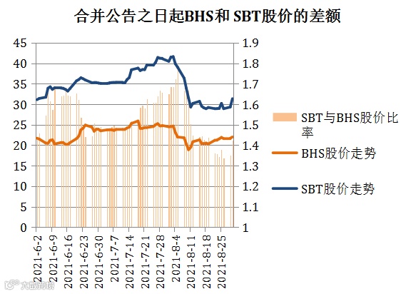 三季度证券市场并购项目亮点是西宁城成功蔗糖股份公司(SBT)与边和糖股份公司(BHS)。SBT与BHS发行互换股票,换股比率1:1.02(1.02只BHS股票可换1只SBT股票)。 这笔交易的吸引力是BHS和SBT兑换之前的价差,高峰期SBT股价高于BHS的1.77倍。因此,投资者预期可以获得从BHS合并前收购与合并后出售SBT股票的差额。