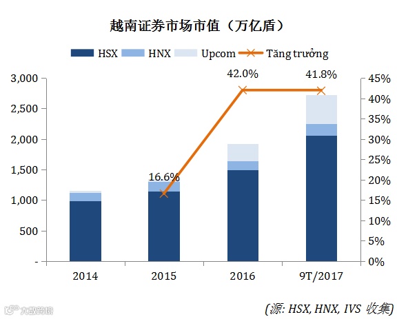 截至9月底越南证券市场总市值达2724万亿盾(相当于GDP的61%),较2017年初增长41.8%。这增速来自于一系列大型公司股份制与上市如 越南盛旺商业股份银行(VPB),天禄集团(LTG)...