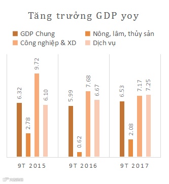 上半年越南经济增长放缓使得世界银行WB,亚洲开发银行ADB 与许多投资者担忧今年实现GDP增速6.7%的目标。利好情况下,这两个机构预测越南GDP增长将接近目标6.4%。二季度季末汇丰银行HSBC认为2017年越南 GDP 仅同比增长 6%。今年后两个季度将难以实现平均增速7%以上,甚至包括油量提升至100万吨的因素。然而,据越南统计总局三季度统计数据(GSO),虽然通货膨胀已接近4%但仍能完成增长目标。这不仅打开了机会的大门,同时也为投资者创造了完全不同的看法。