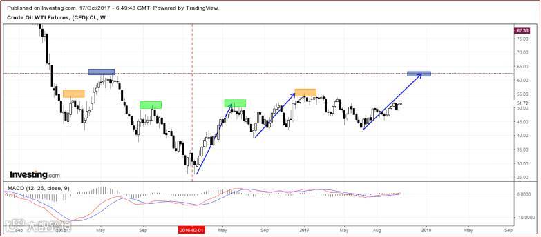 如果第三个上升浪涨幅高于第二个上升浪的1.272倍,预计顶位将在62美元价区。