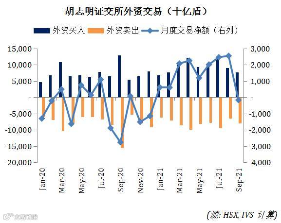 7月和8月在胡志明证交所HSX外资强劲净流入,但与去年9月份相似,因年底通常是外资(特别是大型外国基金)净流出,统计净资产NAV,今年9月外资购买力显著下降。