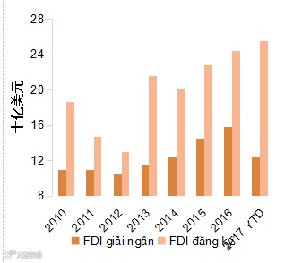 虽然越南经济有望乐观但仍取决于外国投资资本领域,FDI注册总资本创纪录新高达254.8亿美元,发放资金125亿美元。由于FDI与民营资本分别同比增长27.7%和20.7%,社会投资总额增长良好。本季度FDI投资亮点是三星Display,两个BOT第二 义山与O Mon气管道项目。