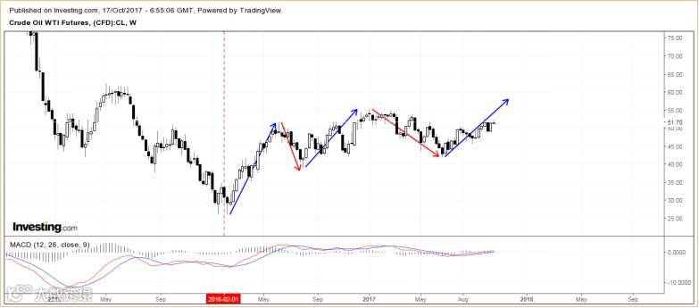 第二个中期上升浪仍从以上底部价位上涨至2017年1月初55美元。这一上升浪中的下行浪延续至今年6月中旬42美元。