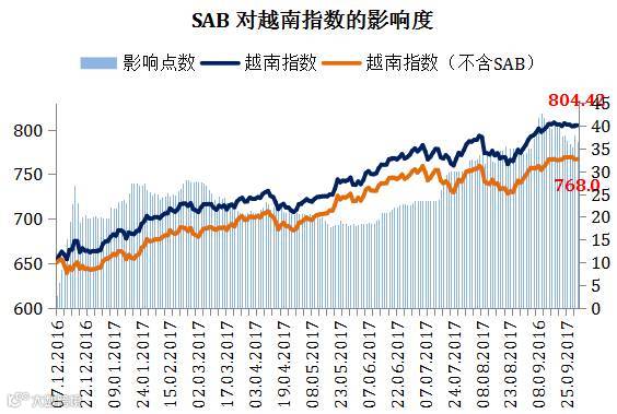 7月-8月份SAB对越南指数影响巨大。截至2017年9月29日累计SAB贡献了36.46点,如果排除SAB,越南指数约768点。