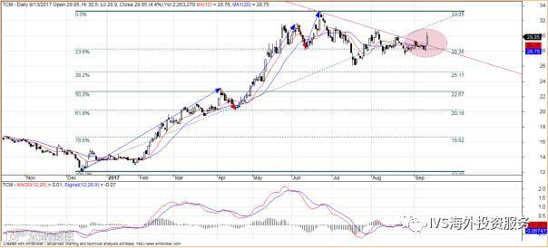 本交易日TCM放量上涨冲破中期下行走势线,成交量放大。MACD日线冲上也预示上行迹象。