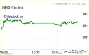 9月13日越南股市开盘FPT, VJC, ROS, PLX蓝筹股上涨推动市场上扬,盘中越南指数冲上804点。但大盘股SAB和VIC下跌使得涨幅缩小。HBC, MWG, FPT, BMP等绩优股交易活跃,吸引资金流入。最终越南指数收盘于802.78点,上涨2.84点,涨幅为0.36%;河内指数收盘于104.43点,上涨0.7点,涨幅为0.68%。