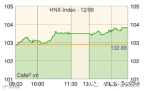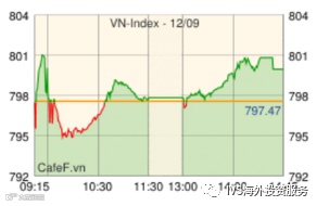 9月12日越南股市开盘SAB BHN, PLX, VJC, MSN,…等大盘股上涨推动越南指数冲上801点,随后ROS大幅下跌导致市场逆转回落,下午银行股MBB放量上涨,购买力增加,最终越南指数收盘于799.94点,上涨2.47点,涨幅为0.31%。河内指数收盘于103.72点,上涨0.83点,涨幅为0.81%。