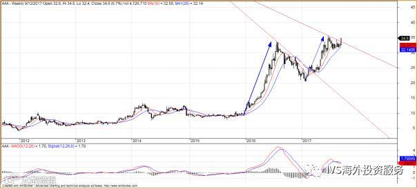 长期:自2015年底-2016年初AAA从9000盾开始第一个长期上升浪。2016年7月该股价见顶33,000盾。此后进入第一个长期下调趋势在2万盾波动。