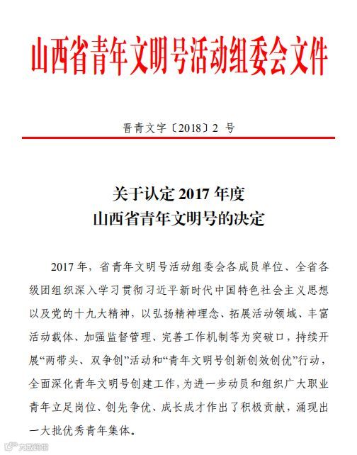 山西股权交易中心有限公司团支部在集团团委和中心党委的正确领导下,努力提高青年职工的业务能力和水平,积极开展丰富多彩的团组织活动,充分发挥了中心广大青年群体的干劲,为中心全年各项工作贡献力量。近日,省青年文明号活动组委会发布《关于认定 2017 年度山西省青年文明号的决定》晋青文字〔2018〕2 号文件,山西股权交易中心再次被组委会认定为“2017年度山西省青年文明号”。这是省青年文明号活动组委会对中心一年来群团工作的肯定,也是为中心继续做好各项工作,努力发挥群团工作优势,助力中心全面发展,提出了更高的要求。