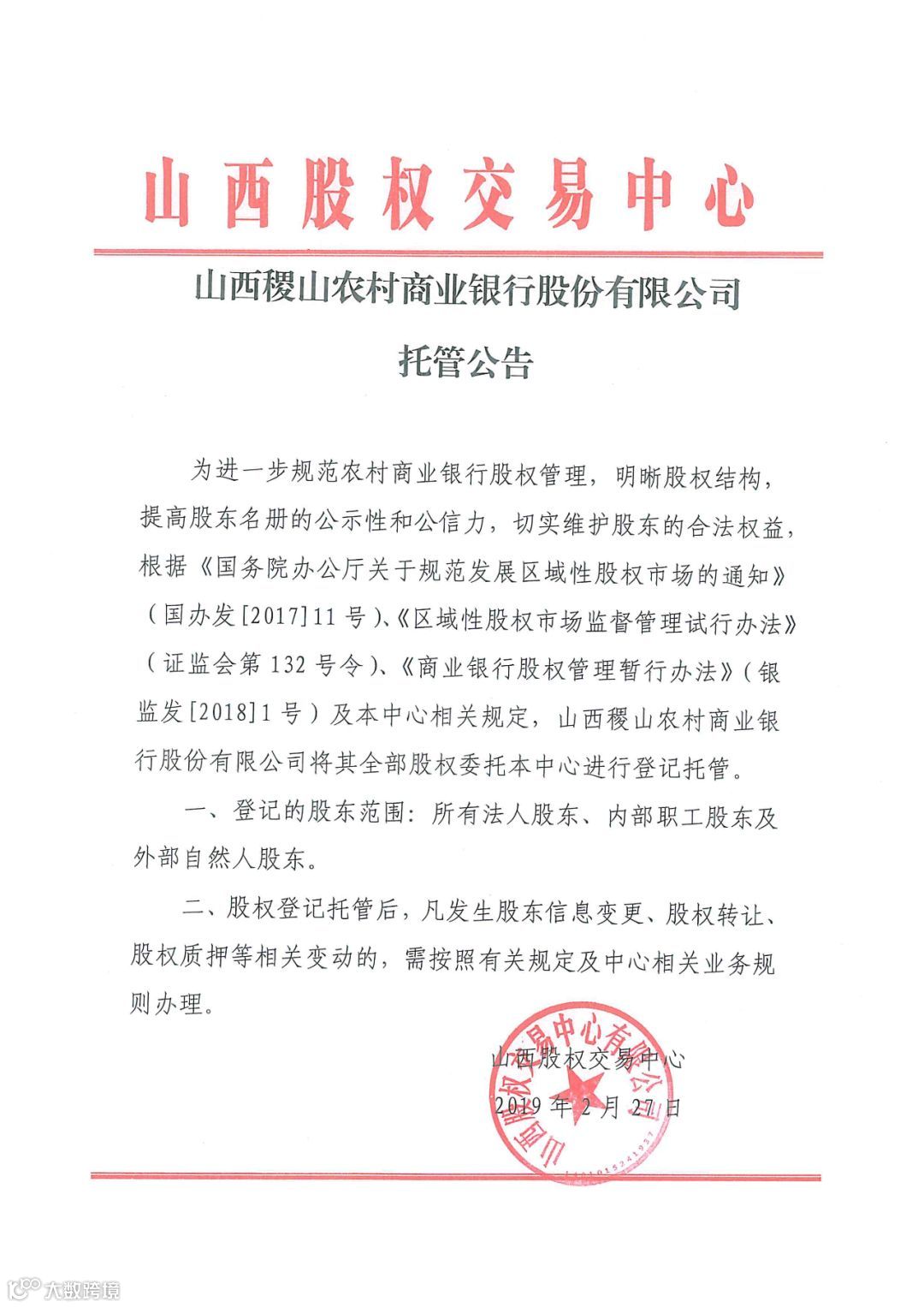 山西稷山农村商业银行股份有限公司托管公告